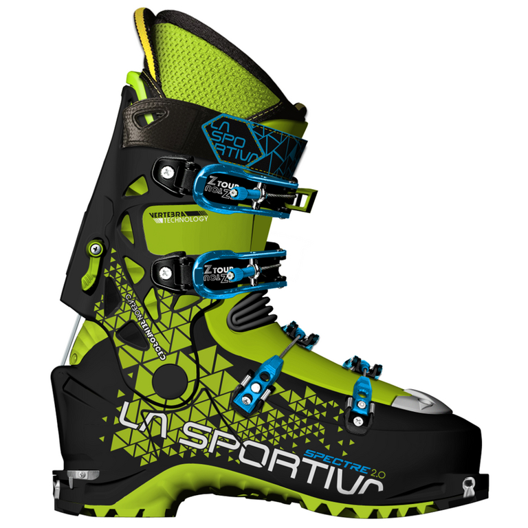 La Sportiva Spectre 2.0 je vylepšená skialpová lyžiarka so 4 prackami pre skialpinistov, ktorí hľadajú perfektnú kombináciu výkonu, ovládania, trvanlivosti a presnosti. Nové Spectre zaručujú mobilitu, ovládateľnosť a jednoduchosť lyžiarskych topánok novej generácie. La Sportiva Spectre 2.0 patrí vďaka svojím inováciám k najlepším touringovým 4-prackovým topánkam. Model disponuje nízkou hmotnosťou, perfektnou tvrdosťou a rýchlym systémom nastavenia módu Ski/Walk. Skelet je vyrobený z ultra ľahkého a odolného materiálu Grilamid®, poskytuje optimálnu flexibilitu. Komín s rozsahom pohybu 60° a EZ Flex™ technológiou použitou na jazyku zaistí maximálnu voľnosť pohybu pri chôdzi ako na strmom svahu, tak na rovine. Vertebra konštrukcia pridáva podporu pre zjazdový výkon. Exkluzívna, nízkoprofilová pracka Pegasus umožňuje makro aj mikro nastavenie pre ideálne prisposobenie zapnutia lyžiarky pre Vašu nohu. Tepelne tvarovateľná papuča z EZ ThermoTM materiálu a vyberateľná vnútorná vložka perfektne ochráni proti chladu.