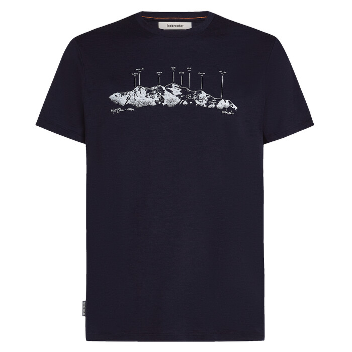 Tričko je vyrobené zo 100 % merino vlny, ktorá zaručuje pohodlie, priedušnosť a sviežosť počas celého dňa. Strih s krátkymi rukávmi a okrúhlym výstrihom sa pohodlne nosí. Posunuté ramenné švy znižujú trenie a zvyšujú pohodlie pri nosení batohu. Tričko zdobí ručne kreslený náčrt masívu Mont Blanc, ktorý zvýrazňuje nadmorské výšky a vrcholy Álp.