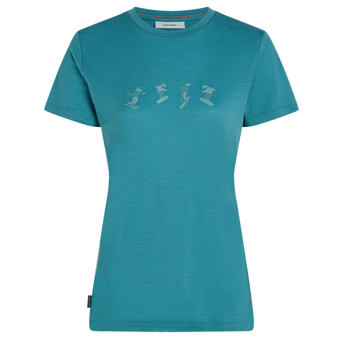 Tričko je vyrobené zo 100 % merino vlny, ktorá poskytuje pohodlie, priedušnosť a sviežosť počas celého dňa. Dámsky strih s krátkymi rukávmi a okrúhlym výstrihom pohodlne sadne. Posunuté ramenné švy znižujú trenie a zvyšujú komfort pri nosení batohu. Hravá potlač lyžiarov a snowboardistov pripomína radosť z pohybu a nezabudnuteľné zážitky v prírode.